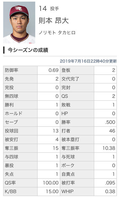 引用元スレ:則本昂大(楽天)防御率0.69、1勝、1敗←これが怪我明けという事実wywywywywywywywywywywywywywywywyw