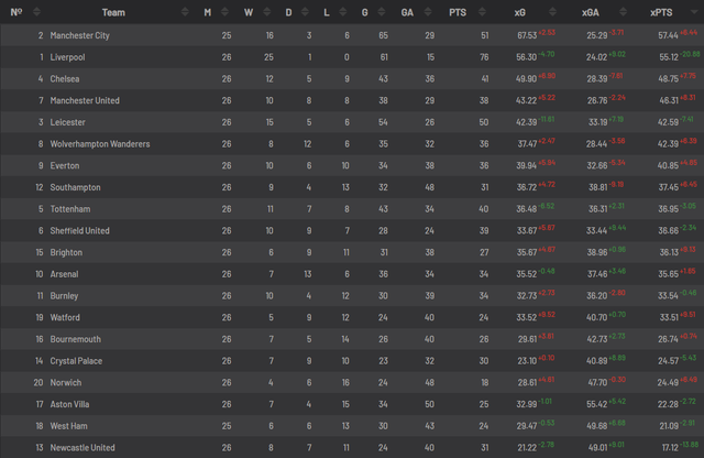 リバプールのxPTSを見ると、なんと実際の勝ち点は20も多い